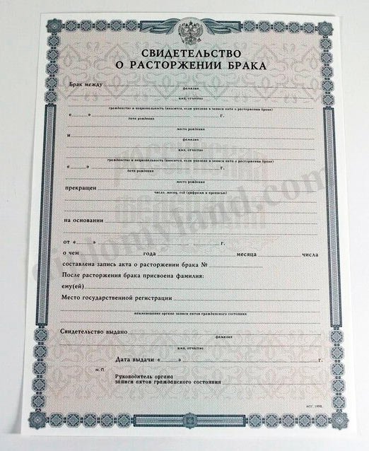 Не теряйте времени даром, если вы попали в сложную жизненную ситуацию и нужно заказать свидетельство о разводе для предъявления в официальных учреждениях. Благодаря нашей компании, вы сможете в течение короткого периода времени предоставить оригинальную бумагу со всеми штампами и печатями. Купить свидетельство о разводе - грамотное решение, позволяющее без нервотрепки оформить необходимые документы. Если вы оказались в ситуации, когда от оперативно предоставленного свидетельства зависит оформление серьезных документов, не медлите - звоните!